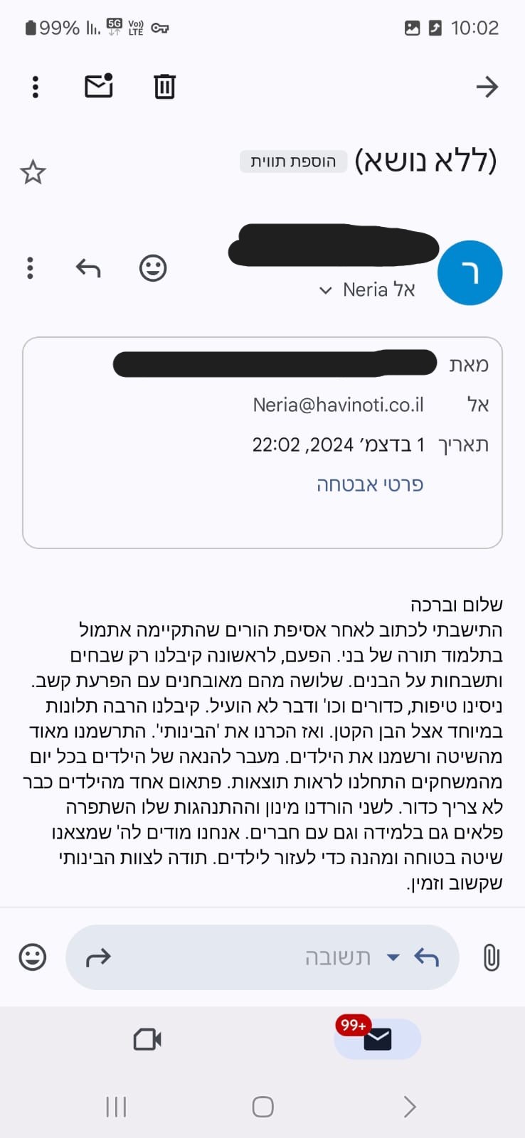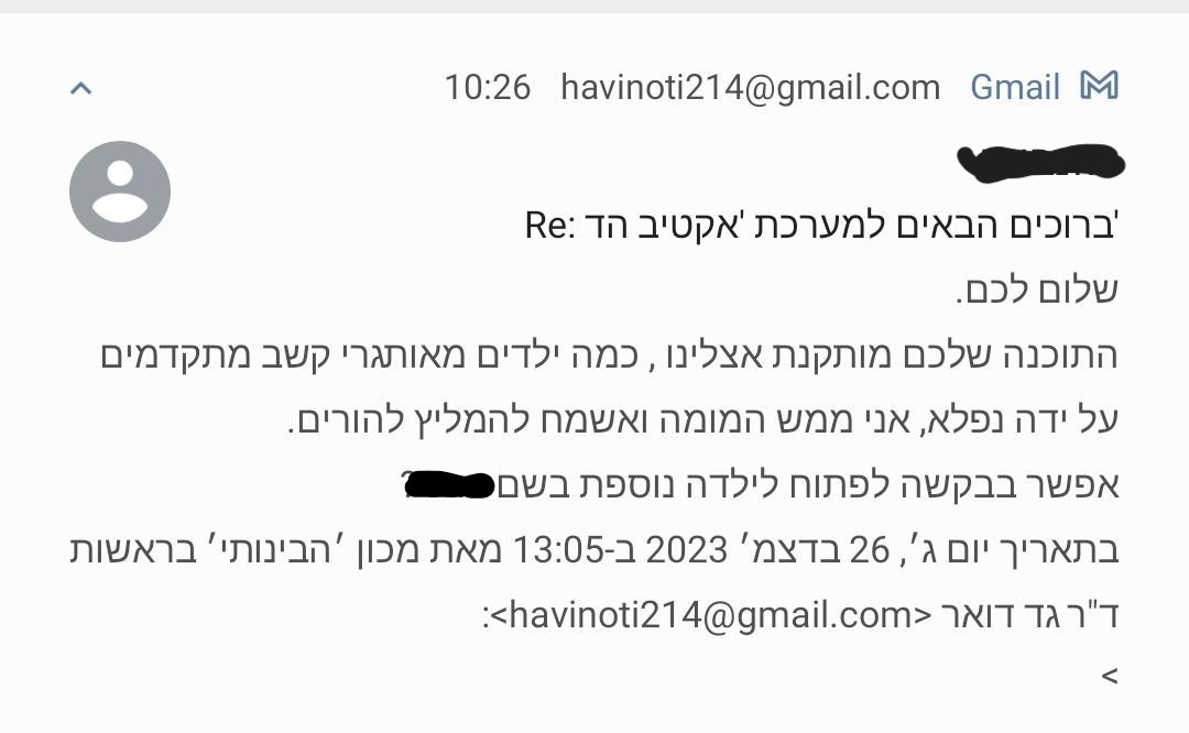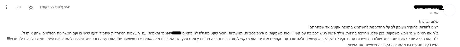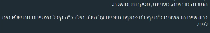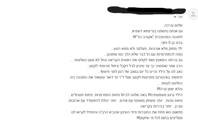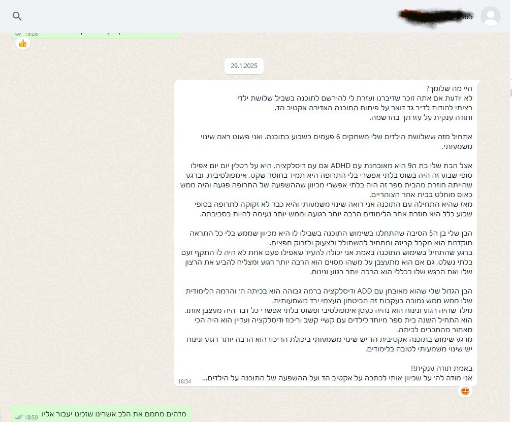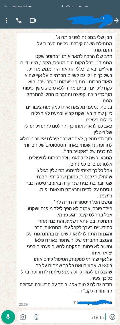 "הוא היה יותר רגוע, מתון, פחות התפרץ בשיעורים וגם בבית ראו שינוי מבחינת אימפולסיביות"