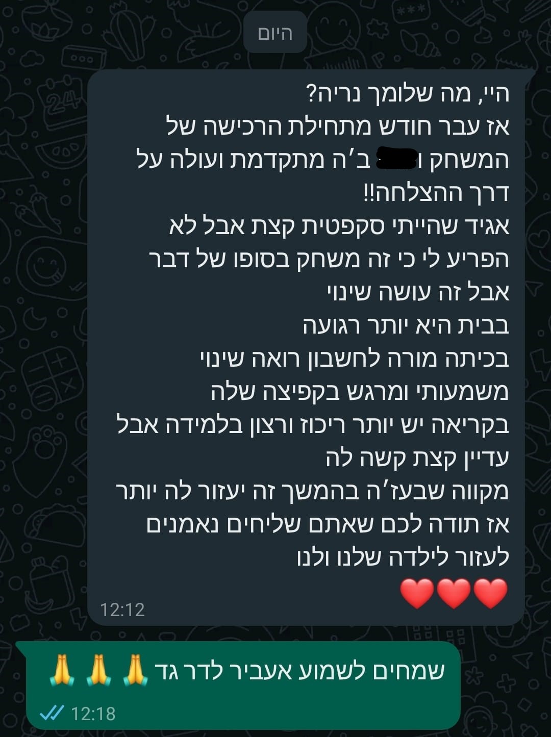 על שיפור בהתנהגות ורוגע כללי"